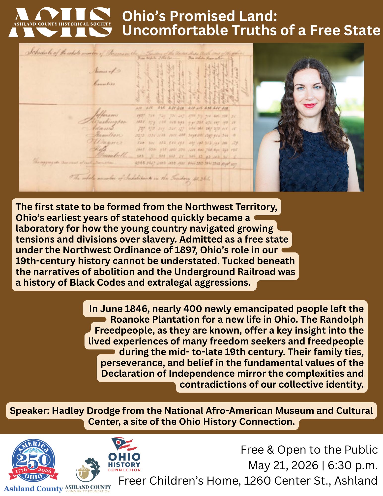 The first state to be formed from the Northwest Territory, Ohio’s earliest years of statehood quickly became a laboratory for how the young country navigated growing tensions and divisions over slavery. Admitted as a free state under the Northwest Ordinance of 1897, Ohio’s role in our 19th-century history cannot be understated. Tucked beneath the narratives of abolition and the Underground Railroad was a history of Black Codes and extralegal aggressions. In June 1846, nearly 400 newly emancipated people left the Roanoke Plantation for a new life in Ohio. The Randolph Freedpeople, as they are known, offer a key insight into the lived experiences of many freedom seekers and freedpeople during the mid- to-late 19th century. Their family ties, perseverance, and belief in the fundamental values of the Declaration of Independence mirror the complexities and contradictions of our collective identity. Join ACHS and Hadley Drodge from the National Afro-American Museum and Cultural Center, a site of the Ohio History Connection, to explore these complexities and the close ties to those who sought freedom in Ashland County.